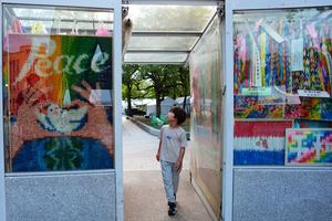 (250806) -- HIROSHIMA, 6 agosto, 2025 (Xinhua) -- Un niño camina junto a grullas de papel usadas para orar por...