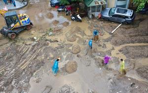 (250806) -- ZHAOQING, 6 agosto, 2025 (Xinhua) -- Trabajadores cortan un árbol derribado por las inundaciones con una motosierra, en...