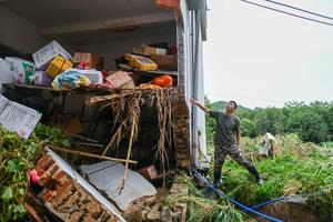 (250806) -- ZHAOQING, 6 agosto, 2025 (Xinhua) -- Un aldeano jefe del Partido revisa una vivienda dañada por las inundaciones,...