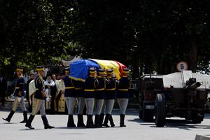 (250807) -- BUCAREST, 7 agosto, 2025 (Xinhua) -- Guardias de honor trasladan el féretro del expresidente rumano, Ion Iliescu, durante...