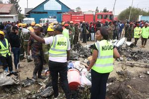 (250807) -- NAIROBI, 7 agosto, 2025 (Xinhua) -- Rescatistas trabajan en el sitio de un accidente aéreo en la zona...