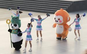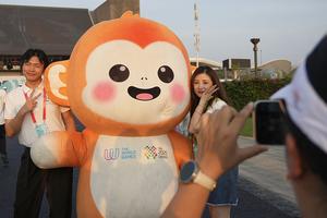 (250807) -- CHENGDU, 7 agosto, 2025 (Xinhua) -- Espectadores se toman fotografías con "Jinzai", una de las mascotas de los...