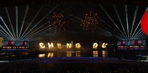 (250807) -- CHENGDU, 7 agosto, 2025 (Xinhua) -- Fuegos artificiales son vistos durante la ceremonia de inauguración de los Juegos...