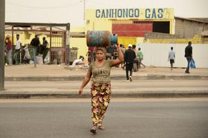 (250809) -- LUANDA, 9 agosto, 2025 (Xinhua) -- Imagen del 8 de agosto de 2025 de una mujer transportando un...