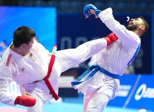(250809) -- CHENGDU, 9 agosto, 2025 (Xinhua) -- Zhai Ang (i), de China, compite ante Taha Mahmoud, de Egipto, durante...