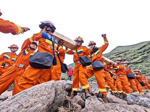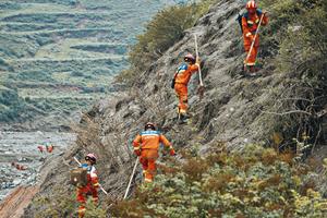 (250809) -- YUZHONG, 9 agosto, 2025 (Xinhua) -- Rescatistas instalan un pasaje temporal, en la aldea de Jiuzhuanggou del poblado...