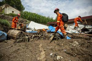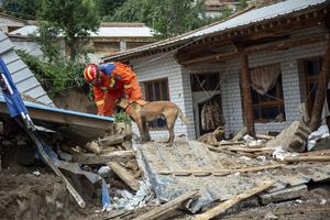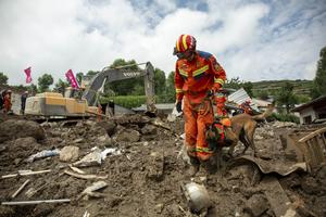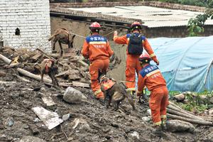 (250809) -- YUZHONG, 9 agosto, 2025 (Xinhua) -- Rescatistas buscan personas desaparecidas con perros de búsqueda y rescate, en la...
