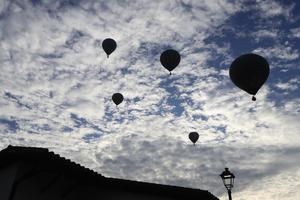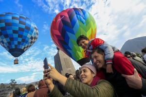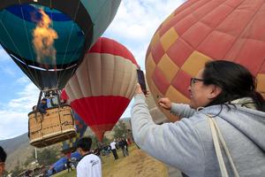 (250808) -- QUITO, 8 agosto, 2025 (Xinhua) -- Una mujer graba con un teléfono móvil un globo aerostático mientras se...