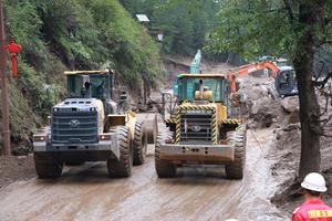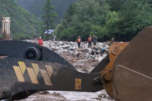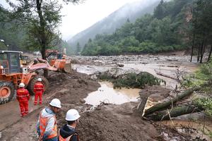 (250808) -- YUZHONG, 8 agosto, 2025 (Xinhua) -- Rescatistas trabajan para restaurar una carretera bloqueada después de los torrentes de...