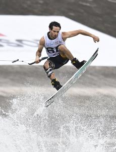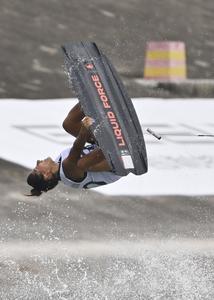 (250808) -- CHENGDU, 8 agosto, 2025 (Xinhua) -- Jorge Rocha, de Colombia, compite durante la clasificación de wakeboard estilo libre...
