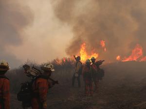 (250808) -- VENTURA, 8 agosto, 2025 (Xinhua) -- Imagen del 7 de agosto de 2025 de bomberos movilizándose para combatir...