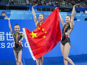 (250809) -- CHENGDU, 9 agosto, 2025 (Xinhua) -- (De izq. a der.) Gu Quanjia, Ding Wenyan y Ma Yixing, de...