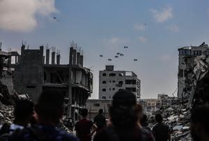 (250809) -- GAZA, 9 agosto, 2025 (Xinhua) -- Imagen del 8 de agosto de 2025 de ayuda humanitaria lanzada desde...