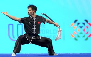 (250809) -- CHENGDU, 9 agosto, 2025 (Xinhua) -- Gao Jiushang, de China, compite durante la final de Changquan-Daoshu-Gunshu masculino del...