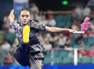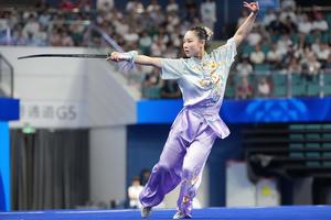 (250809) -- CHENGDU, 9 agosto, 2025 (Xinhua) -- Pang Pui Yee, de Malasia, compite durante la final de Changquan-Jianshu-Qiangshu femenino...