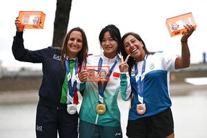 (250810) -- CHENGDU, 10 agosto, 2025 (Xinhua) -- La medallista de oro, Xu Lu (c), de China, la medallista de...