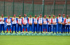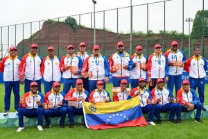 (250810) -- CHENGDU, 10 agosto, 2025 (Xinhua) -- El equipo de Venezuela, medalla de bronce, posa al término de la...