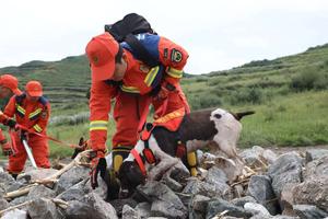 (250810) -- YUZHONG, 10 agosto, 2025 (Xinhua) -- Un rescatista y su perro olfateador buscan personas desaparecidas, en la aldea...