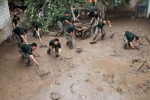 (250810) -- YUZHONG,10 agosto, 2025 (Xinhua) -- Miembros del Cuerpo de Gansu de la Fuerza de Policía Armada Popular limpian...