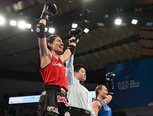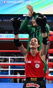 (250810) -- CHENGDU, 10 agosto, 2025 (Xinhua) -- Laura Fernanda Burgos López (i), de México, festeja después de ganar el...