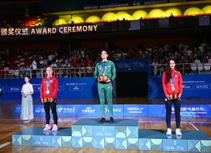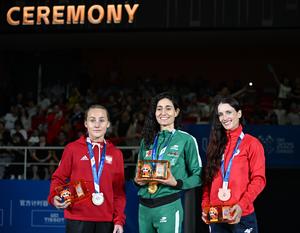 (250810) -- CHENGDU, 10 agosto, 2025 (Xinhua) -- La medallista de oro, Laura Fernanda Burgos López (c), de México, la...