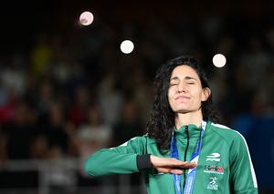 (250810) -- CHENGDU, 10 agosto, 2025 (Xinhua) -- La medallista de oro, Laura Fernanda Burgos López, de México, reacciona durante...