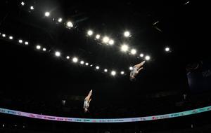 (250810) -- CHENGDU, 10 agosto, 2025 (Xinhua) -- Hu Yicheng/Zhang Xinxin, de China, compiten durante la final de sincronizado femenino...