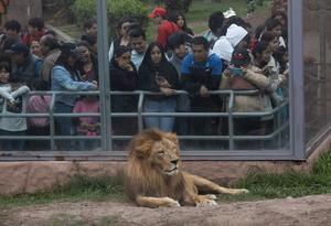 (250810) -- LIMA, 10 agosto, 2025 (Xinhua) -- Imagen del 9 de agosto de 2025 de personas observando al león...