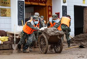 (250810) -- YUZHONG,10 agosto, 2025 (Xinhua) -- Miembros del Cuerpo de Gansu de la Fuerza de Policía Armada Popular limpian...