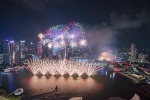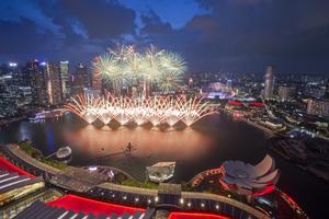 (250810) -- SINGAPUR, 10 agosto, 2025 (Xinhua) -- Imagen del 9 de agosto de 2025 de fuegos artificiales iluminando el...