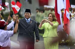 (250811) -- YAKARTA, 11 agosto, 2025 (Xinhua) -- El presidente de Indonesia, Prabowo Subianto (i), y la presidenta peruana, Dina...