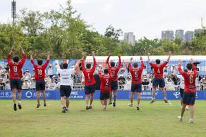 (250811) -- CHENGDU, 11 agosto, 2025 (Xinhua) -- El equipo de Brasil festeja la victoria en el partido del Grupo...