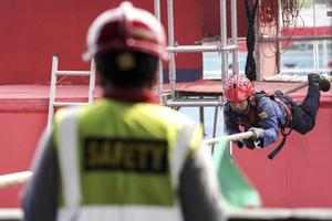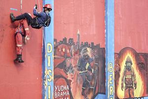 (250811) -- YAKARTA, 11 agosto, 2025 (Xinhua) -- Un bombero participa en una competencia en el Desafío de Bomberos de...