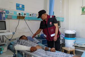 (250811) -- YUZHONG, 11 agosto, 2025 (Xinhua) -- Han Hao (d), un experto del equipo de tratamiento médico y subdirector...