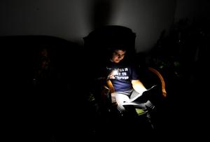 (250811) -- BAGDAD, 11 agosto, 2025 (Xinhua) -- Un niño lee en la oscuridad después de un corte de energía,...