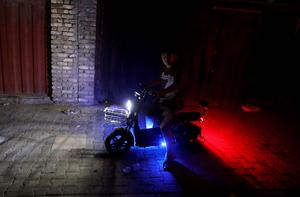 (250811) -- BAGDAD, 11 agosto, 2025 (Xinhua) -- Un niño conduce una motocicleta por una calle oscura después de un...