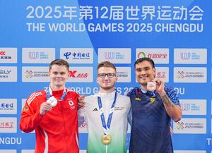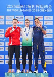 (250811) -- CHENGDU, 11 agosto, 2025 (Xinhua) -- El medallista de oro, Nandor Kiss (c), de Hungría, el medallista de...