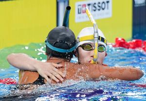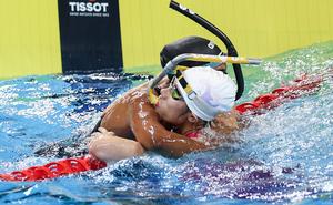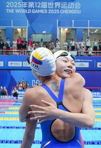 (250811) -- CHENGDU, 11 agosto, 2025 (Xinhua) -- Hu Yaoyao (d), del equipo de China, abraza a una atleta del...
