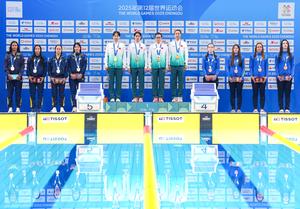 (250811) -- CHENGDU, 11 agosto, 2025 (Xinhua) -- El equipo de medallistas de oro de China (c), el equipo de...