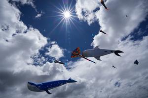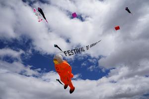 (250811) -- BOGOTA, 11 agosto, 2025 (Xinhua) -- Imagen del 10 de agosto de 2025 de cometas gigantes volando durante...