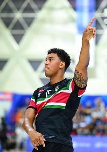 (250811) -- CHENGDU, 11 agosto, 2025 (Xinhua) -- Randell van der Steen, de Surinam, festeja una anotación durante el partido...