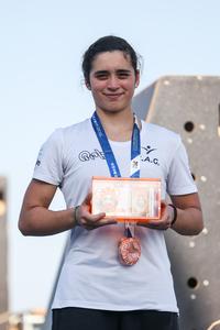 (250812) -- CHENGDU, 12 agosto, 2025 (Xinhua) -- La medallista de bronce Sara Banchoff Tzancoff, de Argentina, posa durante la...