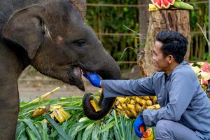 (250812) -- BALI, 12 agosto, 2025 (Xinhua) -- Un cuidador del zoológico alimenta a una cría de elefante de Sumatra...