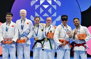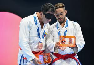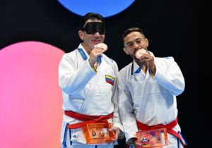 (250812) -- CHENGDU, 12 agosto, 2025 (Xinhua) -- Los medallistas de bronce, Jeison Camilo Mora (d)/Edgar Mauricio Castillo Villamarin, de...