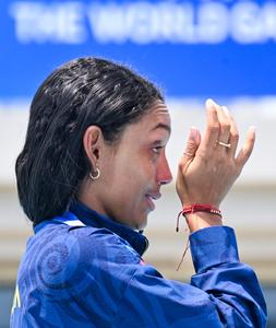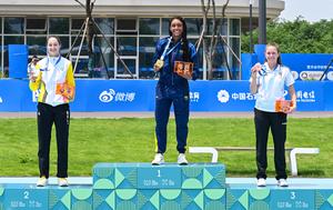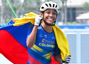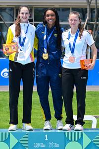(250812) -- CHENGDU, 12 agosto, 2025 (Xinhua) -- La medallista de oro María Fernanda Timms Ariza, de Colombia, reacciona durante...
