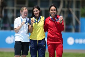 (250813) -- CHENGDU, 13 agosto, 2025 (Xinhua) -- La medallista de oro Gabriela Rueda (c), de Colombia, la medallista de plata Marine Lefeuvre (i), de Francia, y la medallista de bronce Valentina Alejandra Letelier Cartagena, de México, posan durante la ceremonia de premiación de la carrera eliminatoria femenina de 15.000 m de patinaje de velocidad en línea en ruta en los Juegos Mundiales 2025, en Chengdu, en la provincia de Sichuan, en el suroeste de China, el 13 de agosto de 2025. (Xinhua/Chen Bin) (jg) (da) (vf)
