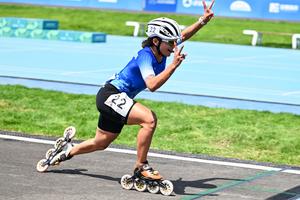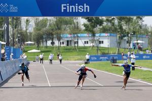 (250813) -- CHENGDU, 13 agosto, 2025 (Xinhua) -- Ivonne Saraí Nóchez Gallardo, de El Salvador, reacciona al cruzar la línea...