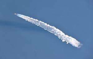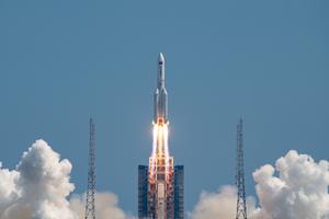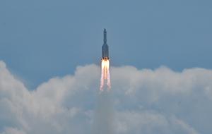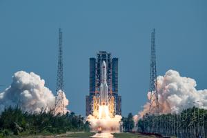 (250813) -- WENCHANG, 13 agosto, 2025 (Xinhua) -- Un cohete portador Gran Marcha-5B que transporta un grupo de satélites de...
