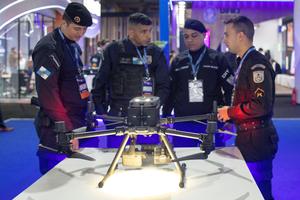 (250813) -- RIO DE JANEIRO, 13 agosto, 2025 (Xinhua) -- Visitantes observan un dron policía exhibido durante la Rio Innovation...
