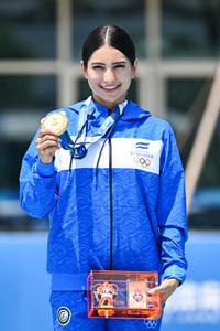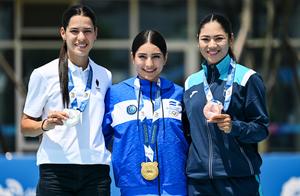 (250813) -- CHENGDU, 13 agosto, 2025 (Xinhua) -- La medallista de oro Ivonne Saraí Nóchez Gallardo, de El Salvador, posa...